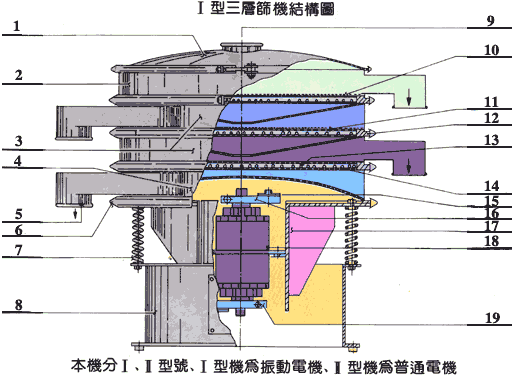 | 上图部件名称标注: ⑴盖、⑵上框体、⑶中间框体、⑷下框体、⑸出料口、⑹紧固环、⑺弹簧、⑻底座、⑼进料口、⑽筛网、⑾衬网、⑿法兰、⒀弹跳球、⒁弹跳板、⒂加重板、⒃上偏心板、⒄电机座、⒅振动电机、⒆下偏心板 |